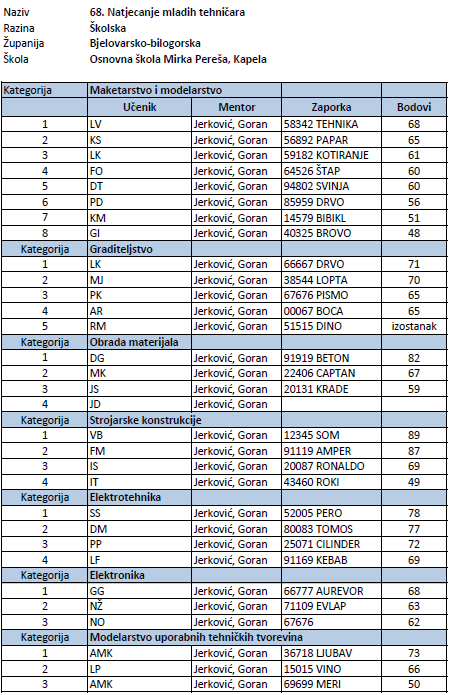 U našoj školi natjecanje je okupilo 31 učenika, koji su se natjecali u 7 kategorija. Tijekom četiri dana učenici su pokazali zavidnu razinu tehničkog znanja, spretnosti i odgovornosti u radu. Posebno nas veseli velik interes učenika za sudjelovanje, kao i njihova motiviranost za daljnje usavršavanje u području tehničke kulture.